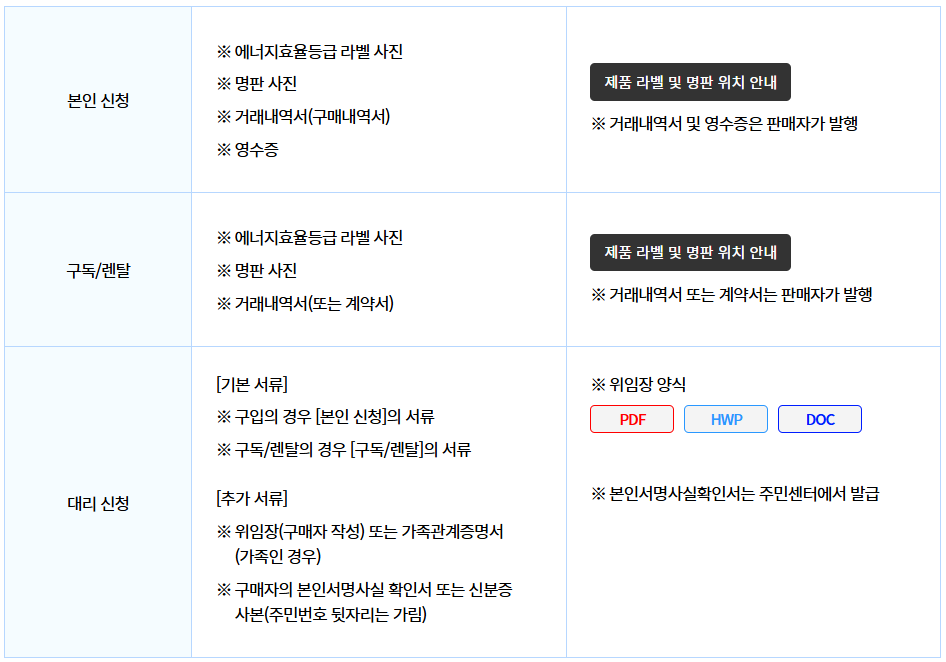 영수증에는 모델명, 결제 금액, 구매 날짜가 명확히 기재돼야 하며 온라인 구매 시 주문 확인서 또는 거래 명세서 등을 추가 제출해야 할 수 있습니다.