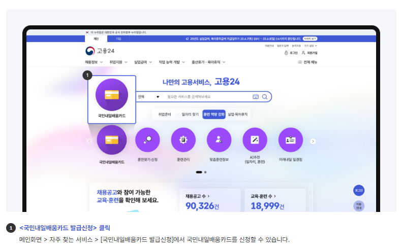 신청은 고용24(구 HRD-Net)에서 진행되며, 회원가입 후 국민내일배움카드 발급 신청 메뉴를 선택하면 됩니다.