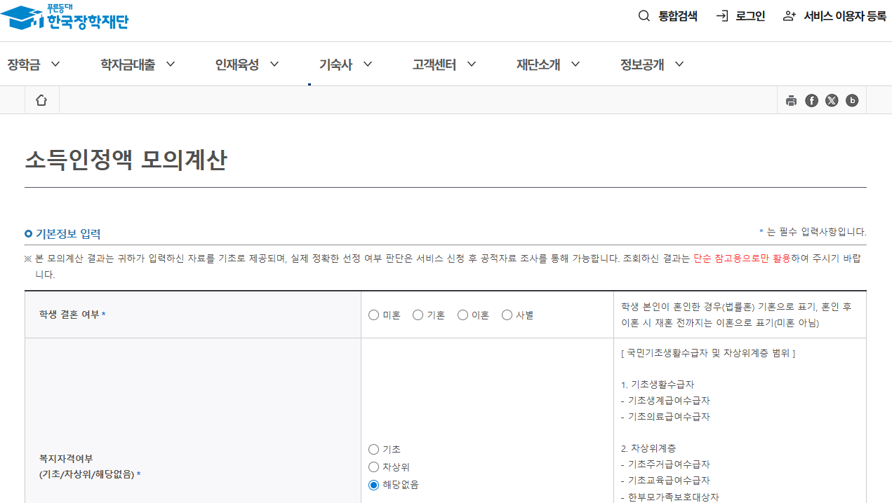 한국장학재단 누리집에서 소득인정액 모의계산 서비스를 제공합니다.