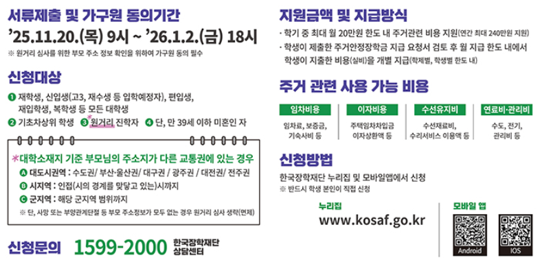 주거안정장학금은 원거리 통학이 어려운 기초·차상위 학생에게 임차료, 수도·연료비, 관리비 등 실제 생활에 필요한 주거 비용을 지원합니다.