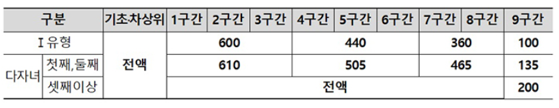 • 1~3구간 : 600만원(다자녀 첫째, 둘째 610만원)